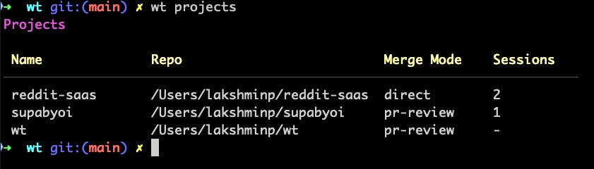 wt project list showing registered projects with their paths and bead counts. wt itself is built using wt, I know, so meta.