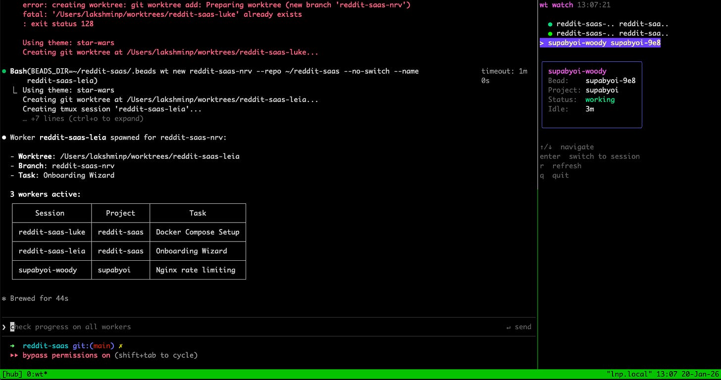 This isn’t optional. Beads is how I track work - git-backed issues with dependencies, labels, and full history. Every task is a bead. Every worker needs to know which bead it’s working on.